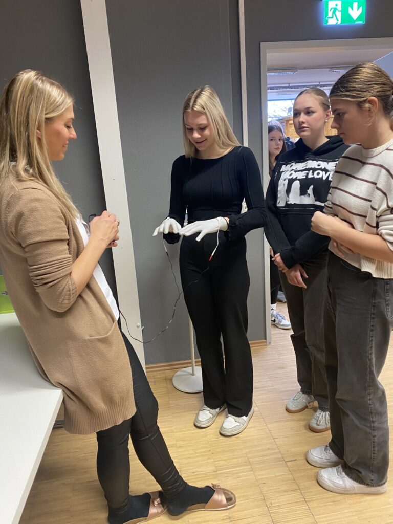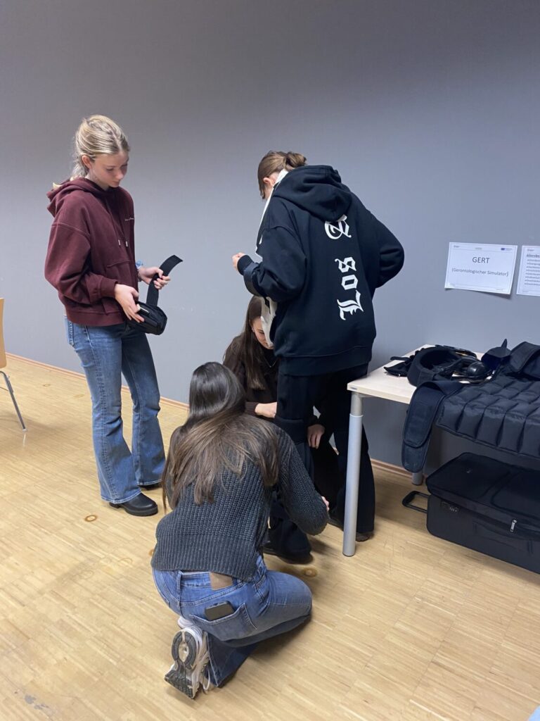 Durch verschiedene Simula­tionen – darunter Gewichts­anzüge, Seh- und Hörbe­ein­träch­ti­gungen sowie der Einsatz von Bewegungs­hilfen – spürten die Schüle­rinnen am eigenen Körper, welche Heraus­for­de­rungen der Alterungs­prozess mit sich bringt. Diese praxis­nahen Erfah­rungen haben nicht nur ihr fachliches Wissen vertieft, sondern auch ihr Verständnis und ihre Sensi­bi­lität für die Bedürf­nisse älterer Menschen nachhaltig gestärkt.